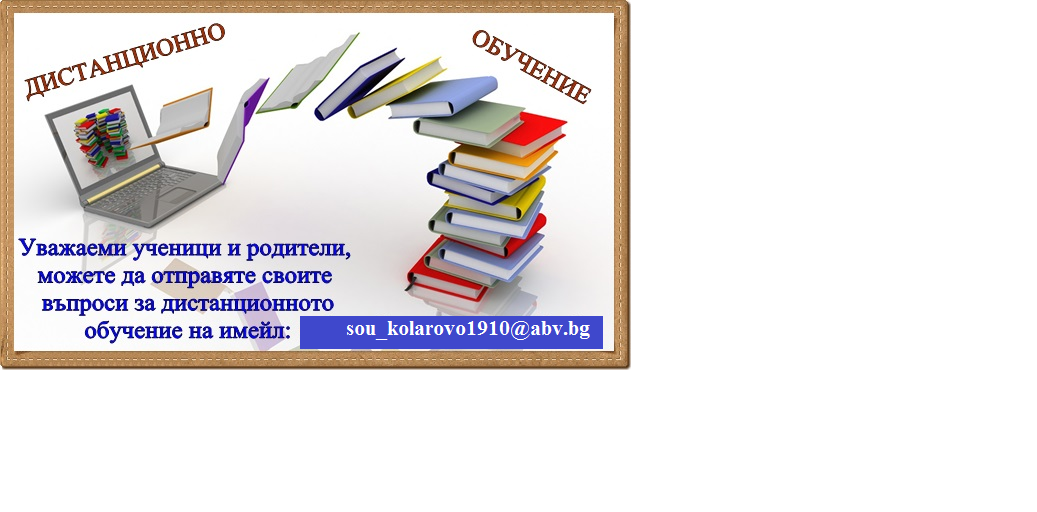 Относно въпроси, мнения и препоръки може да се свържете с кл. ръководители, преподаватели по предмети, директор и зам.-директор.Също така можете за отправите и вашите въпроси и мнения на имейл:sou_kolarovo1910@abv.bg, както и на страницата ни във фейсбук: